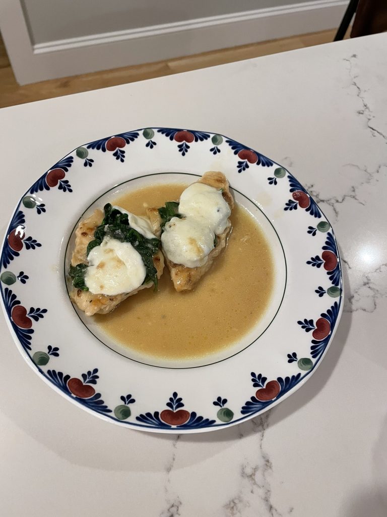 Top each breast with spinach and a slice of mozzarella cheese. You can cover skillet to help cheese melt quicker.